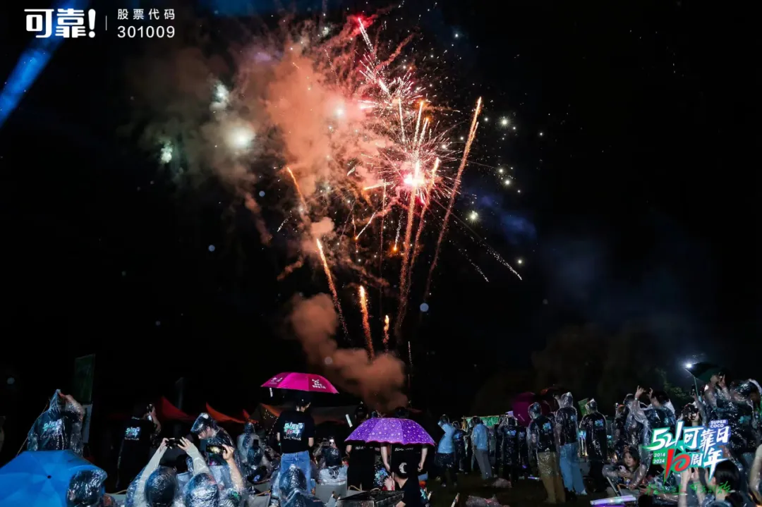 蛋糕分享结束后,主持人带领大家倒计时迎接烟花惊喜,伴随着现场可靠人齐声高喊:10、9、8、…3、2、1倒计时结束,现场气氛达到高潮,满场烟花惊喜绽放,带着众人的祝福和心愿升上高空。晚会在浪漫的烟花中落下帷幕,2024年521可靠日以浪漫而美好的姿态镌刻在每一名可靠人心中。