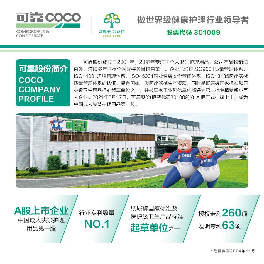 可靠股份自成立以来,始终关注国内、国际银发产业发展趋势,并围绕用户为中心,不断挖掘养老服务消费潜力,致力于做世界级健康护理行业领导者。从产品创新到品牌关怀,可靠股份用24年专注重新定义护理品质,更好满足用户对产品与服务的追求!我们期待与社会各界共绘银发经济新蓝图!