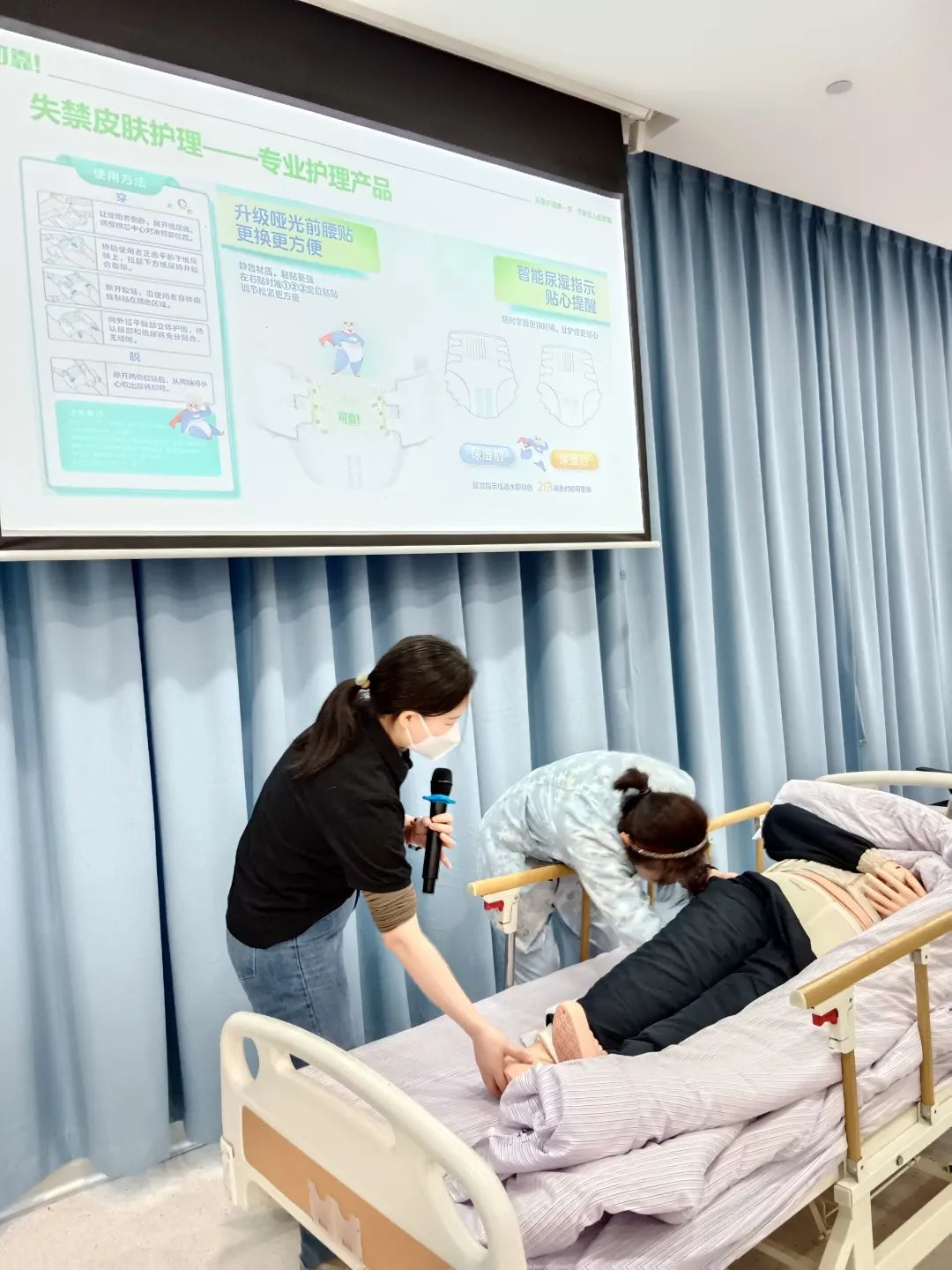 在派发礼物后,可靠护理讲师在院内开展了“春季老人皮肤护理讲堂”,针对春季老人皮肤较脆弱、容易受到细菌侵袭的特点,讲解失禁人群皮肤护理、失禁护理产品选择和使用等相关知识,并邀请护工上台交流护理实操经验。凭借专业的讲解和服务态度,可靠护理讲师们赢得了现场一致好评。